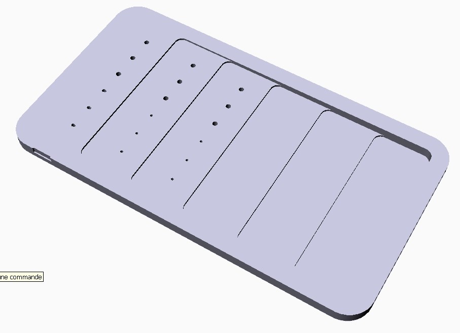 Des plaques épaisses sont usinées afin de créer des étages. Un contour de 15 à 20mm de largeur est préservé pour éviter les déformations de la plaques lors et après l'usinage. En effet, la modification locale de la séquence d'empilement libère des tensions qui cintrent ou vrillent la plaque. Des trous à fond plat (FBH) sont usinés à différentes profondeurs pour simuler les délaminages entre des plis bien déterminés. La précision de la profondeur de l'usinage est la clé de la qualité du calibre. Des usinages de bords sont également réalisés tout comme des 'oreilles' attenantes à certains trous pour simuler le délaminage de perçage. Les trois premières photos ci-dessous concernent ce type de cale étagée avec des trous de 3 et 6mm (FBH), des drill delamination et edge delamination. La face externe de la cale est couverte d'un bronze mesh (application aéronautique).